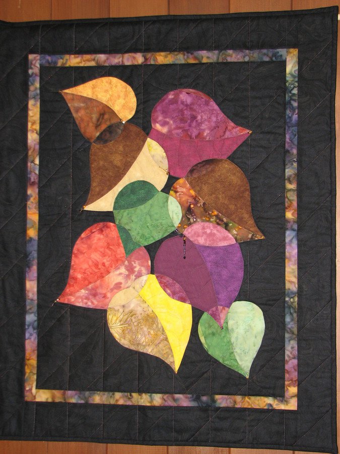 | Design Source - Description | Multi-coloured "topstitch" piecing leaves on black textured background; added beads |