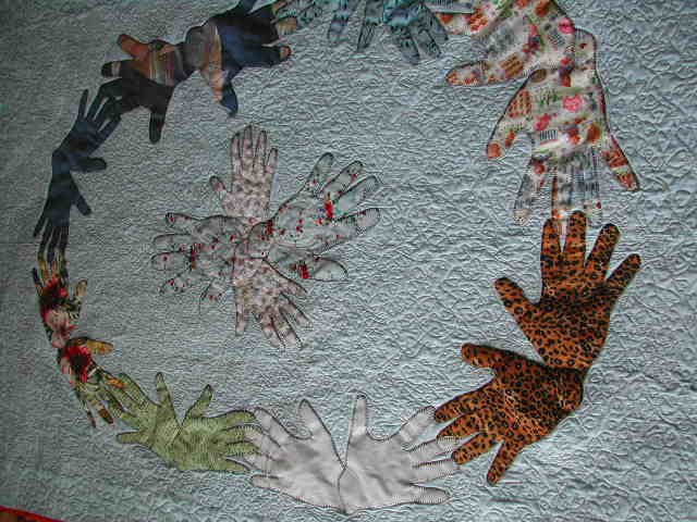quiltercpa Hearts and Hands - Created at St. George Island, FL using applique of family member hands. Each person chose his/her fabric to reflect each personality. Mother and Daddy's hands are in the center surrounded by their children and spouses.