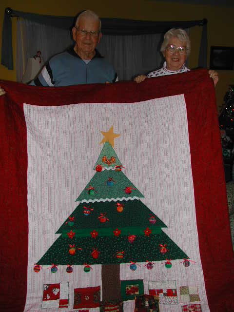 | Design Source - Description | Uses many techniques. Started during hurricane season when without electricity. Gifts under the tree are all made by hand. Machine Embroidery. Applique. machine and hand piecing. Given to Mother and Daddy. |