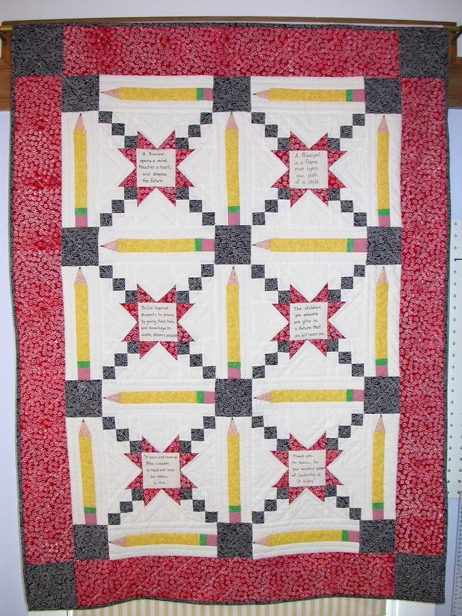 quiltydoc Quilt for School Principal - Our Principal was retiring, and I adapted this "teachers" quilt for a principal, and individualized the messages within the stars. It's got 3 D Star Points made with folding and sewing. Way cool.