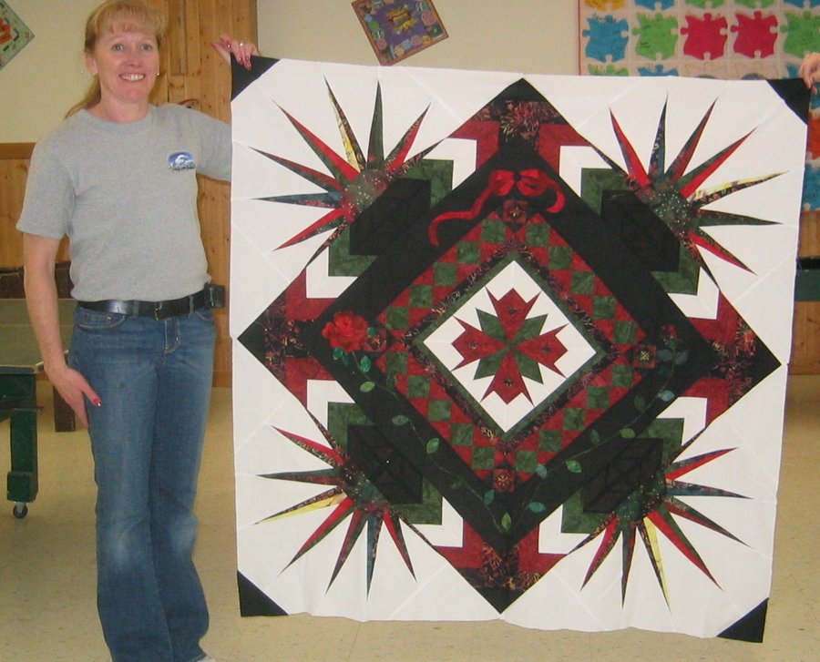 nativeofcolo Sunshine & Flowers - This block was created by 6 great friends who are always up for a challenge over a 1 year period. We had a challenge fabric that was to be included when each person added their part and any fabric that the orignator passed along. All of them turned out beautifully and no one looking like the other. I have added a green 2" border, will bind it with red and will be hand quilting for the first time with the guidance of a Juanita.