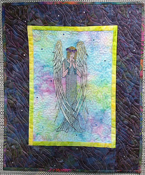 | Design Source - Description | I made this art quilt for my son's girlfriend, Angela. The picture is based on a drawing by 19th century artist Aubrey Beardsley. I thread painted the angel and embellished the quilt with flat-back jewels. |