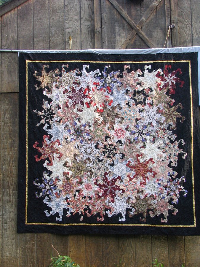 orbitalquilter Dizzy Swirls - This is a variation on Stack - n - Whack using an equilateral triangle as a base. I drew a random curved line from the center to one side, copied the line to the other two sides. Each triangle has a light, medium and dark shape. Six triangles form a swirl at the center. It was great fun! These were all oriental fabrics. I want to do more with this technique.