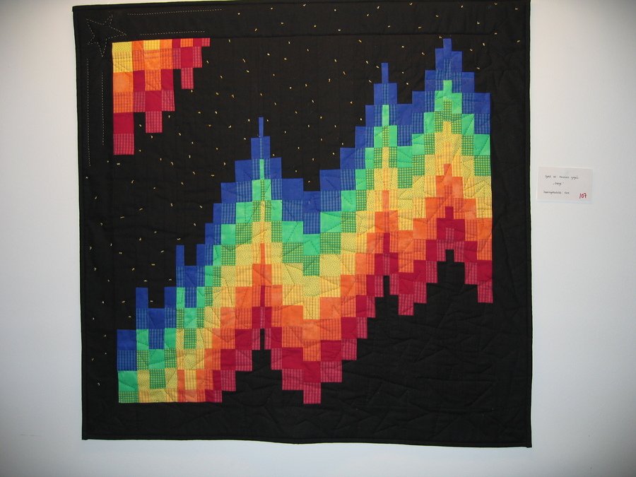 malyn Univers - Quilt were made as an gift to my husband. It is mainly hand quilted with lots of stars in different sizes. In the black areas it is tied with yellow tread with the knot on the front to give the impression for a sky at night.