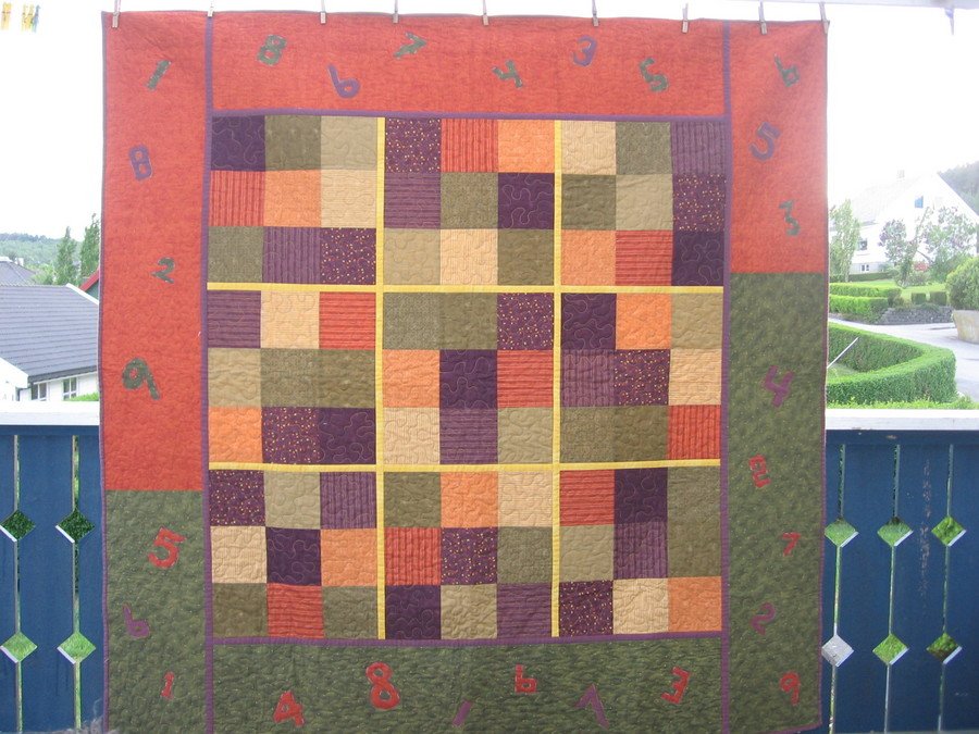 malyn Houston Sudoku - Quilter from Sweden came up with the idea that a sudoku could be a pattern for a quilt. I had just been to Houston and I wanted to make something to my self to remind me of my trip there. On a bus trip to old Houston I had found a set of fabric that I had fallen in love with. And in the airport in Norway I got me a book with sudoku to puzzel with on my trip to Houston. So I used all of theFabric in this sudoku quilt. I is my biggest quilt so far. The Quilt is quilted i sections and then put together with a technic describe in a norwegian book called "Lappesprell og quiltestreker" by Hanne Asplin Firman. On the border I got my daughters to draw numbers 1 to 9 in different styles and appliqued them to the quilt in three different colors.
