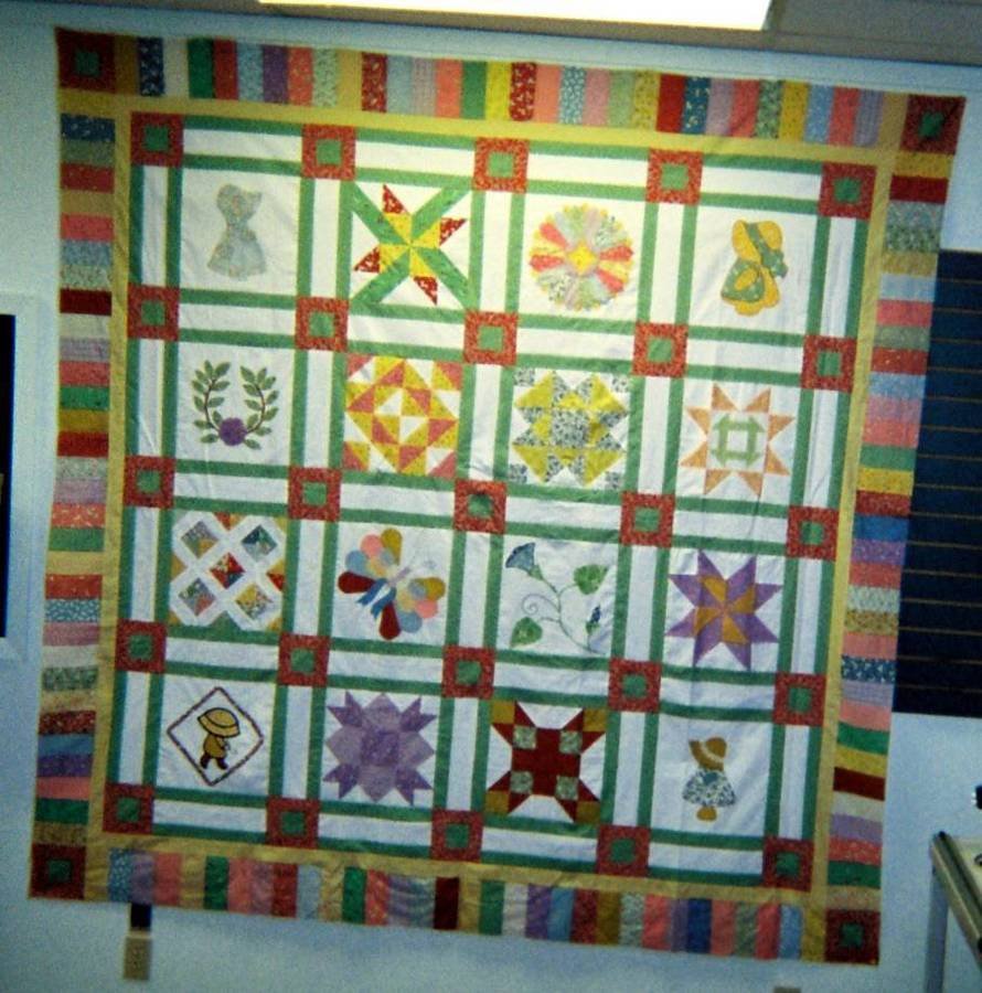pdking2002 COOLEY HOUSE SAMPLER - QUILT WAS A SET OF MYSTERY BLOCKS WINNER DIDN'T WANT. WE WERE ASKED TO MAKE A RAFFLE QUILT FOR HOME IN LOUISIANA FOR SEVERELY DISABLED PEOPLE(FOR RESIDENTS WHO DO NOT HAVE SOME ONE TO HELP WITH THE LITTLE EXTRAS , CHRISTMAS GIFTS, AND SAME ESSENTIALS OF LIFE. SO THIS WAS A TRUE GIFT TO BE ABLE TO MAKE SOMETHING TO HELP SO MANY PEOPLE; I HAVE KNOW PEOPLE LIVING THER SINCE I WAS WAY YOUNGER THAN I AM NOW. THE TICKETS ARE $2.00 EACH, AND THE QUILT WILL BE RAFFLED ON SEPTEMBER 18,2008. TRULY A WONDERFUL CAUSE. SIZE IS APPROX. I MEASURED IT ABOUT 4 MONTHS AGO. IT WAS QUILTED BY DIANE JORDAN OF VICKSBURG, MS.