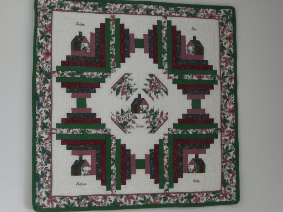 | Design Source - Description | This is from a quilt class I took on foundation piecing. Each corner block is embroidered with the first name of one of our family and the center block with our family surname. |