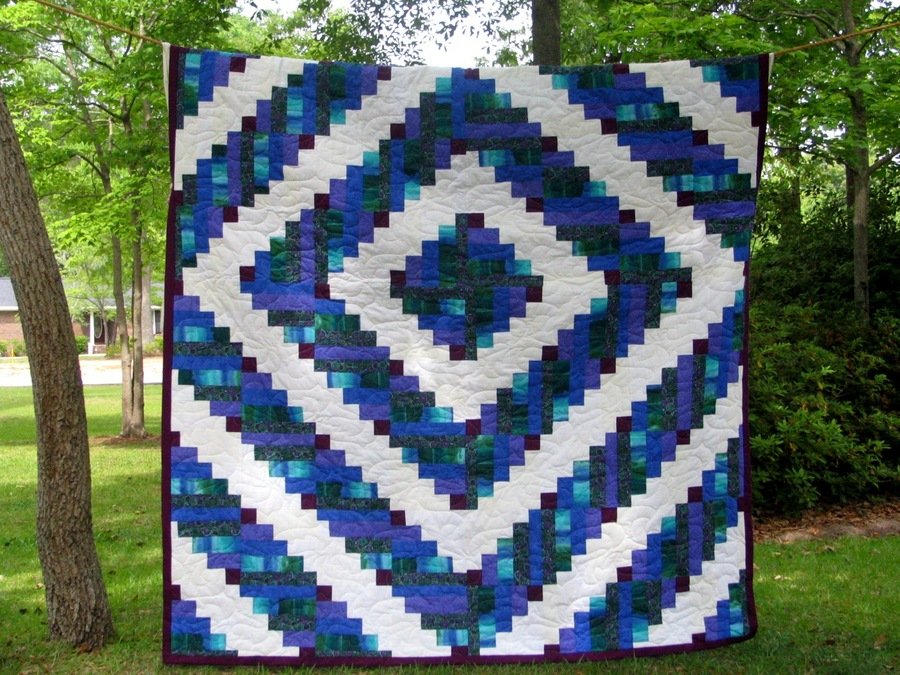 bevster Avon Inspiration - I was inspired by a Avon Catalog to make this quilt. There was a photograph of a model wearing a beautil shear dress in all colors of blues and greens. To me it was the most beautiful color combination I have every seen. This was my first quilt and not having the knowledge regarding different types of blocks, I found instructions on the internet for this faux log cabin block. Beverley Linsley