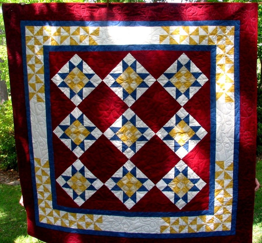 bevster Southern Stars - I can't remember just where I located this pattern, however, I though it was just beautiful with the added Pinwheel blocks in the 1st border. It is a striking wallhanging. I made this for my Son and his wife. They are a military family and the stars suited them well. On the label I wrote "Stiched by my hands with Love from my Heart - Mom".