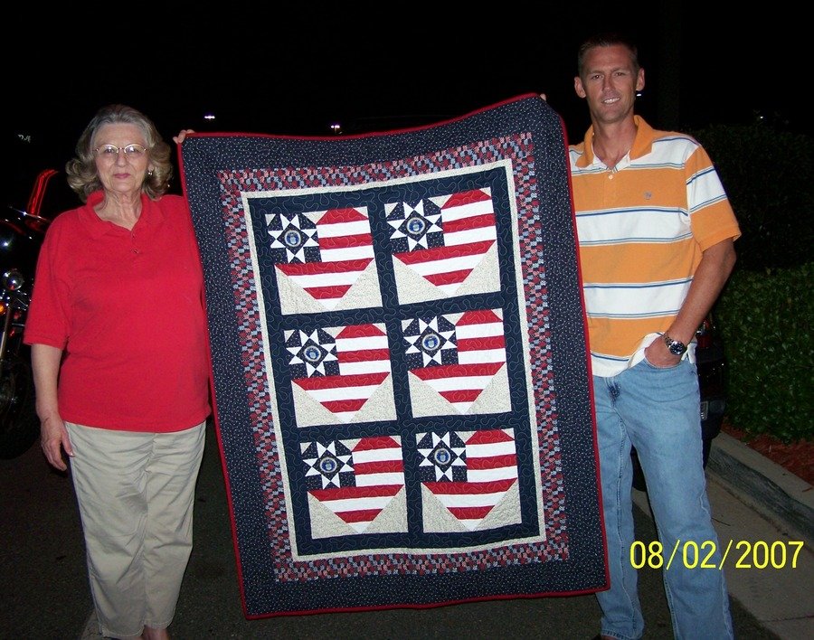 bevster Air Force - I found this pattern in a quilting magazine; however, for the life of me I can't remember which one. I appliqued the Air Force Logo in the middle of the star. Since my Son is a CMSgt in the USAF I thought he would love the design - HE DID! I believe the size was 45x45 however it may be a little smaller. I am unable to located my notes on this quilt, so I have to give an estimate on the quilt size.