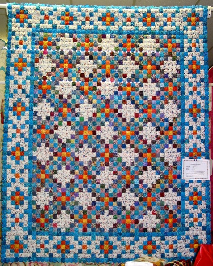 | Design Source - Description | Designed in EQ5 and constructed in blocks joined in a horizontal setting. All scrappy except white which is Christmas snowman print. Closeup in personal photos |