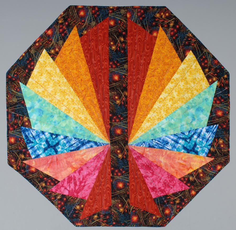 CarolynArts Squirt - I wanted to make an octogon shaped quilt and this is what I came up with. It is hung with a HangYourQuilt.com hanger and a support bracket. I hurried to get this done for a 'Opus6' gallery show in Eugene, OR.This photo was taken before the bead embellishments were put on. I made this one twice, once as a regular pieced pattern and again as a paper pieced pattern. They both came out O.K. I have a large creative drive and even tho I don't know how to quilt properly I am having a great time learning.