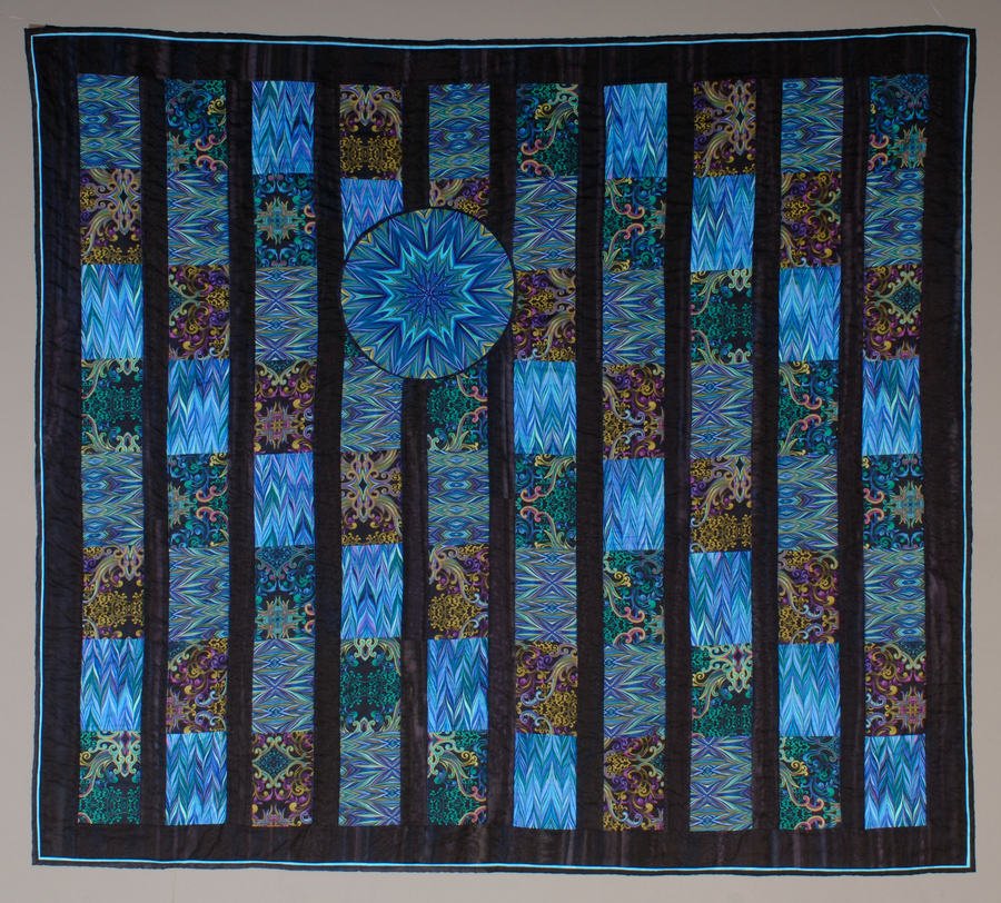 CarolynArts Blue Moon - When I first saw this fabric I 'knew' I had to make something out of it. I loved the colors and the designs. I also had to have the round design in it. I prewashed the fabric like I was instructed to do for quilts and much to my dismay the circle had changed into an oval. I had one heck of a time fitting it in and it didn't really fit right. We all love it tho and my DH thought it should be on our living room wall but Squirt finally won out. This quilt is now in Newport on display at the shop where I bought the fabric.