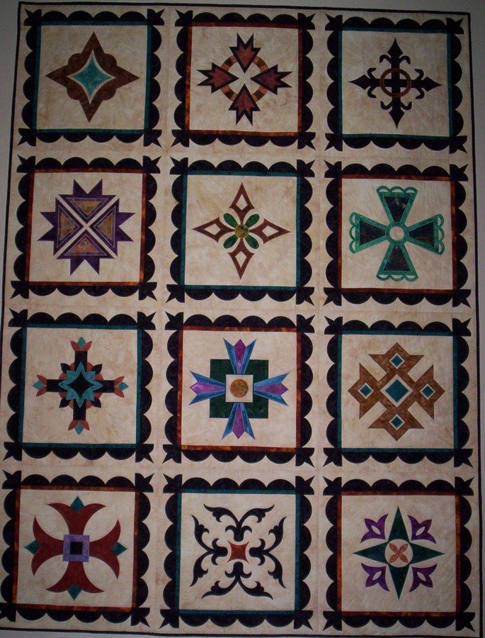 janicejonesabq Las Cruces - In the quilt there are 12 different appliqued cross patterns, each having a narrow accent border and an appliqued border inspired by a traditional Spanish timnwork frame design. Each block is machine appliqued in the hoop on a computerized embroidery machine.
