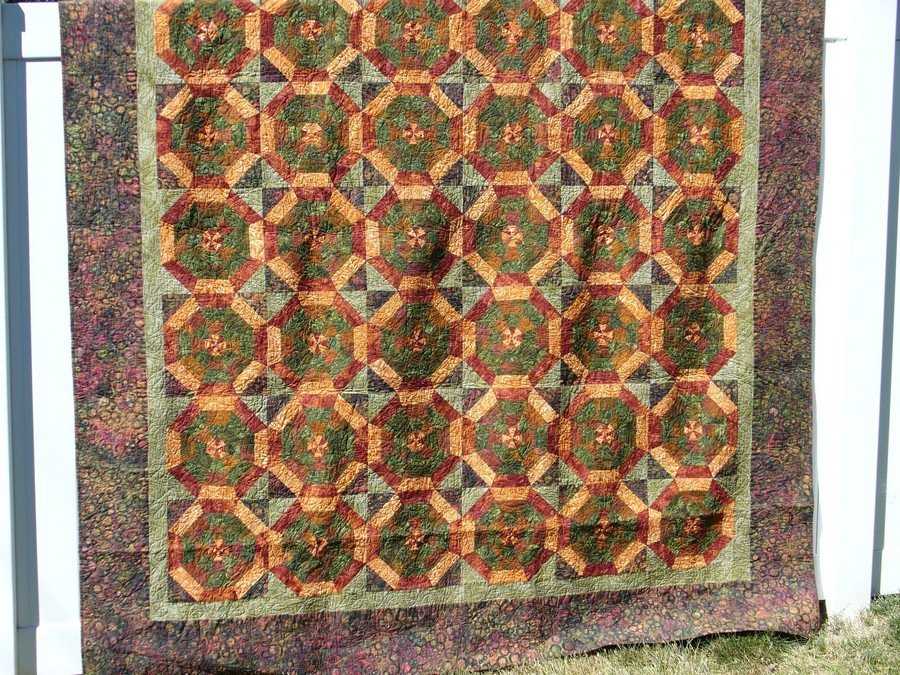 lilylane Mystery Quilt - This was a mystery quilt offered by Among Friends Quilt Shop, Louisville, KY. The shop used Laurel Burch fabrics. I love batiks so I chose the boarder fabric (not knowing what the pattern was) and the shop chose the other fabrics. The first month we were given four fabrics and they were to be stripped. The next month we were given the ruler and told to cut the strip sets. The next month we sewed them all together. It was a fun project.
