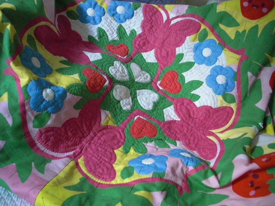 okiegirl97 Happy - I love Hawaiian applique and I love Japanese pop art, so this is my attempt at both. My design was printed by the good folks at Spoonflower.com and I'm in the process of hand quilting it. I am so in love with this quilt!!! The backing is an enormous red and white polka dot.