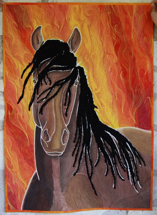 ClaraLawrence Intense Horse - A stallion from a nearby barn inspired this quilt. While I was photographing him, he seemed to just glow in the hot summer. I played with sheers in the quilt to add a little zing and intensity. The yarn has angora in it to add a softness that this stallion also had in his personality. The quilting is very dense and added a painted feeling to the piece. It was a finalist at the International Quilt Show in Houston 2008. My first quilt show and I got in. Yipee!