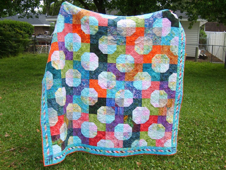 dragonflye Batik Bowties - I used all my favourite Batiks in this quilt. When constructiong the bow-tie blocks, I saved the little snippets from the corners and used them to make the one inch finished half-square triangles that are in the border. This is the first quilt that I put into a show. Our local guild has a small show and BOY did I learn a lot! Can't wait for our next one!
