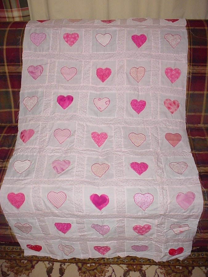 quilterguy27 Found Hearts - I aquired this unfinished quilt top from a donated storage unit in Arkansas. All I know is: I think the makers name is Donna and from the accompanying literature I think it was made around 2003 possibly in Springdale, AR. Just wanted to share it with everyone. There are many uncompleted blocks with it. I'm sure the maker was either planning on making it bigger or making 2 seperate quilts.
