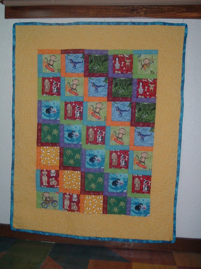 TerriH from grandma t - This quilt is my 2nd, made for my first grandchild. I fussy cut boyish images from a variety of fabrics and used bright borders to help him learn basic colors and animals. The border is stippled and the blocks have loops and flowers in the solid color edges.