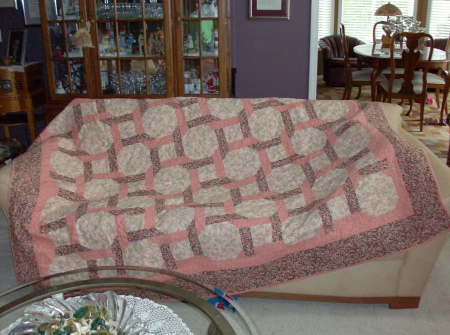 klynn8220 DIANA'S 50TH BIRTHDAY QUILT - THIS QUILT IS ABSOLUTELY BEAUTIFUL IF YOU PLAN IT JUST RIGHT. YOU WILL NEED A LIGHT FLORAL AND A DARK OPPOSITE FLORAL USE A VERY GOOD CONTRAST SO THAT THE INTERLOCKING PATTERN EMERGES. I MADE THIS FOR A DEAR FRIEND OF MINE WHO BEAT LYMPHNOMIA CANCER IN STAGE FOUR. I MADE THIS FOR HER 50TH BIRTHDAY MARCH 1, 2008. IT GOES PERFECT IN HER COTTAGE UP NORTH IN HER BACK PORCH ROOM.