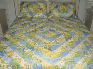 DestinDeb "Sunshine" and Shadow - I bought April Cornell's Sunshine Fat Quarter Bundle this spring and this quilt was the result. I had just enough material to piece the top with very little left over. This was the first bed sized quilt that I quilted on a domestic machine.