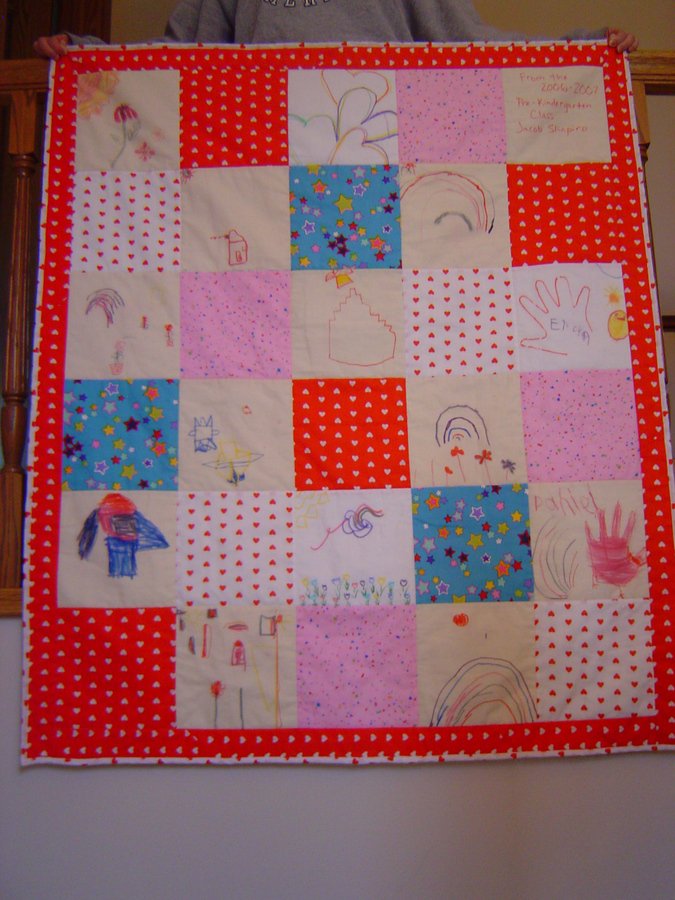 JanetHuisinga Linus Project - Katherine's son's kindergarten school class drew on the block and we used misc fabrics to fill the rest of the squares to make this quilt. It was a donation to the Linus Project and Katherine purchased it.