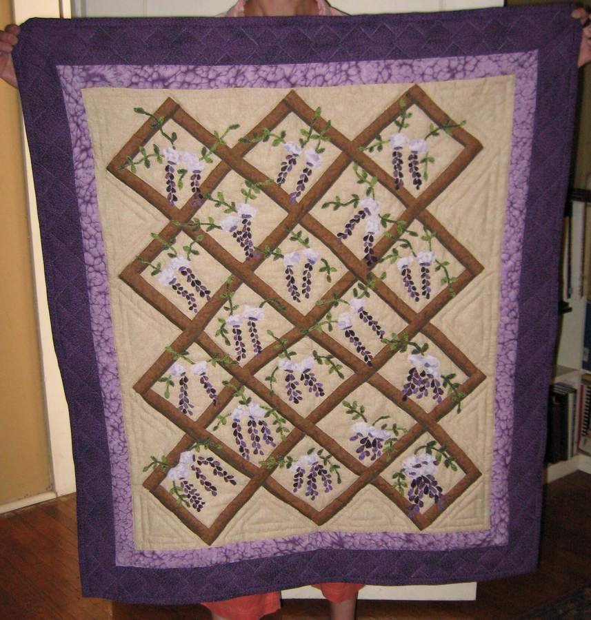 nyneve Wisteria - This quilt was designed for a coworker on her retirement. She had recently had a trellis installed and planted wisteria. She plans on spending her time gardening.