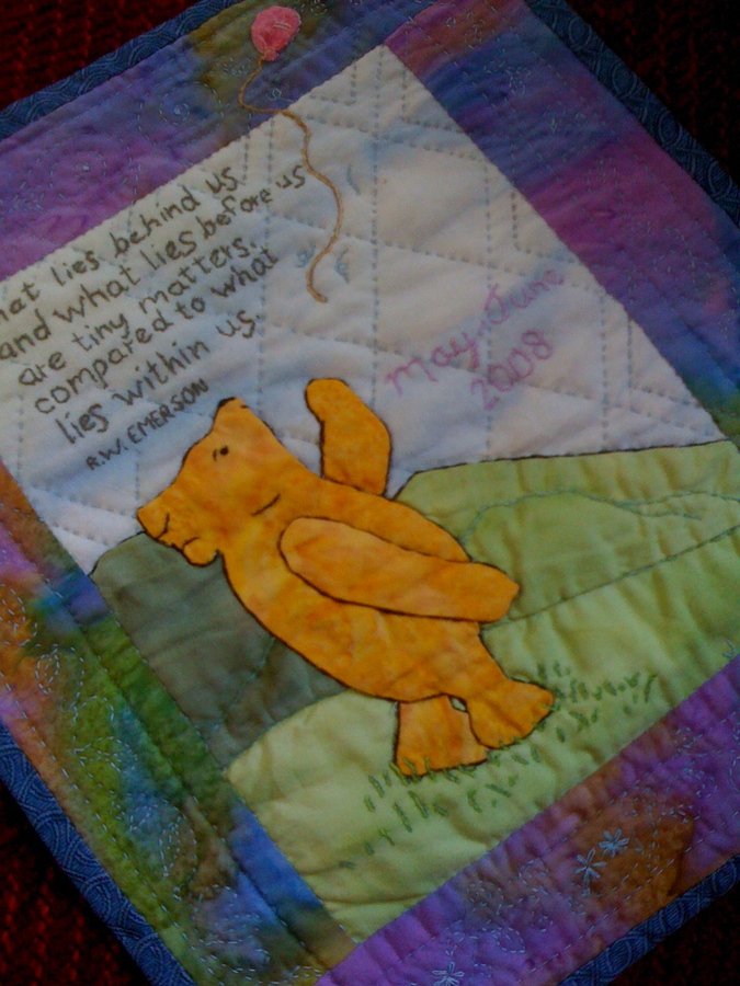 | Design Source - Description | My first attempt at hand applique and hand quilting - so I did a journal quilt expressing the letting go of some expectations I realized I had on my children. :) |