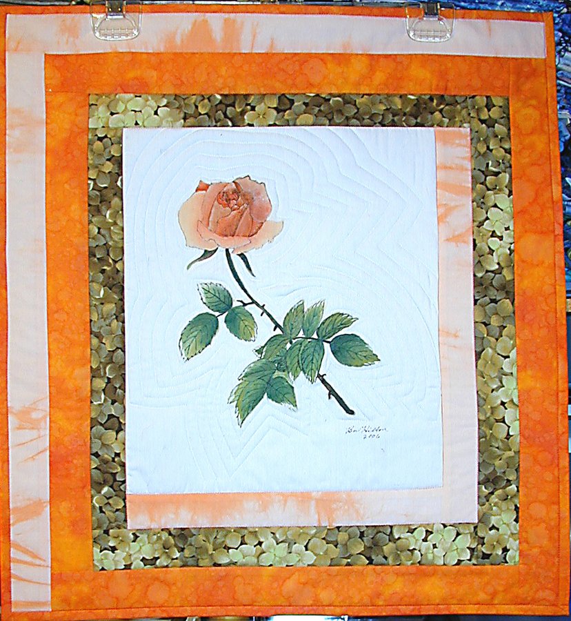 Bevhilton1 Donna's Rose - Peach rose, painted on fabric under the tutelage of Evie Salzmann, balance my own hand-dyed fabrics. Presented to my sister, Donna Foster, for Christmas, 2006.