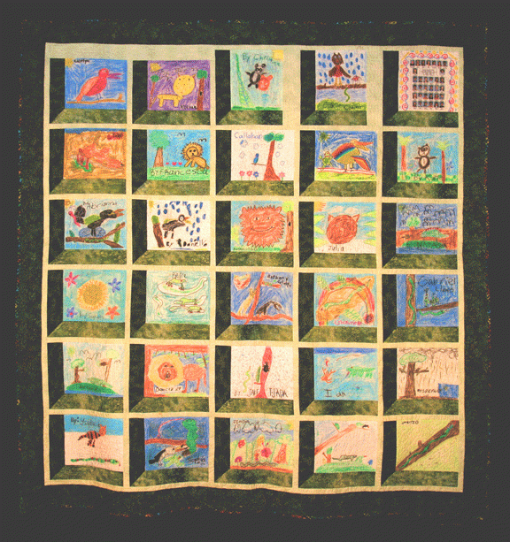 | Design Source - Description | Second Graders drew pictures of Rainforest animals on fabric using oil pastels. Blocks were set in attic windows pattern. Machine quilted on HQ 16. |