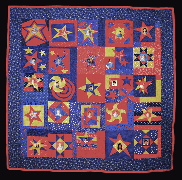 need2sew Sixth Grade Stars - The sixth graders used construction paper to make patterns for these blocks. They could draw their own stars or use traditional star blocks. The photos were transfered by ink jet printer and appliqued to each block. Machine quilted using HQ 16.