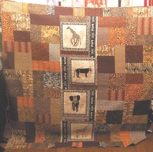 Malsthe1 "SKINZ" - This quilt makes use of the "Turning Twenty" quilt block. It has been done using various animal print fabrics. I was fortunate enough to be in Kansas City area attending MQS this year and while there found the animal panels at a little fabric store in Overland Park, Ks. I had already put the top together, but when I arrived home I took it apart in the center and placed the panels. They were a perfect marriage for the quilt. Oh, by the way, my Mom and Dad absolutely love it.