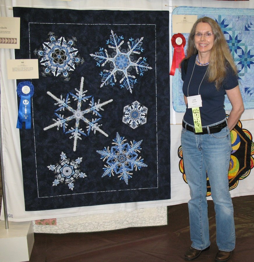 keeper Snow Daze - This is the most challenging quilt I have made so far. Each snowflake consists of hundreds of tiny pieces of fabric, "fussy cut" using plastic templates, and pieced with 1/4" seams. No curved piecing or applique was involved. Snowflake patterns are Paula Nadelstern, and quilting was inspired by Diane Gaudynski. Snowflake close-ups and explanations of the process can be seen in the "My Personal Photos" section.