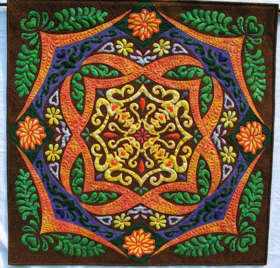 keeper Ehrnst Rhapsody - I made this Rhapsody quilt for my dear in-laws' 60th anniversary. Colors were inspired by a bouquet that they loved, but the secret of the quilt is in the medallion---it is their last name "Ehrnst", mirrored and repeated. For the quilting, Superior Bottom Line and 100 weight silk threads were used. It was the first time I tried quilting feathers.