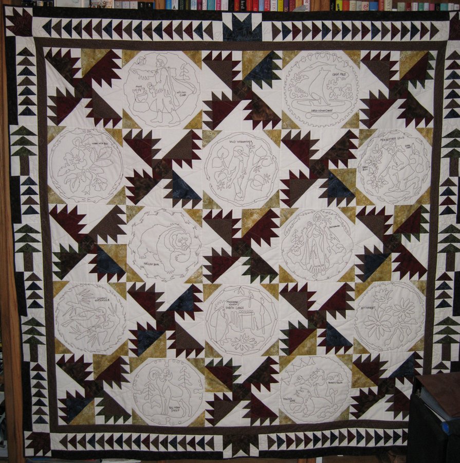 linlhines Lewis & Clark Trails - My sister loves Lewis & Clark so when I came across this pattern I had to make it for her. The medallions are machine embroidered and the lettering was done by hand. I used a feather adaption for the borders and straight line quilting in the Indian Trails Blocks. It was a challenging project for me but it came out great and I know she'll love it! It's one of the biggest projects I tackled on my domestic machine.