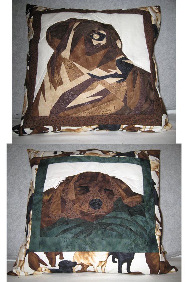 linlhines Chocolate Lab Pillows - The puppy pattern came from QuiltMaker Magazine (June/July 2007) and Star is a design by Linda Hibbert of Silverlinings Originals. My sister has 2 chocolate labs so I thought I would make her these pillows. They are paper pieced and I chose my own fabrics. Have you ever tried to find dark brown fabric in Las Vegas? They were fun to make and my sister loves them.