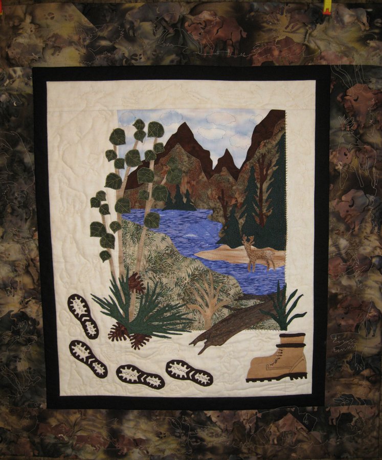 linlhines Worth the Hike - I bought this pattern and kit at Mountain Lady Quilt Shop in Estes Park, CO on a trip to Rocky Mountain National Park. It is a great reminder of a very scenic trip and also of a fabulous quilt shop. It mostly fusible applique and quilted in the open spaces with various animal motifs and free motion anchoring down the pieces. Makes me want to go back!