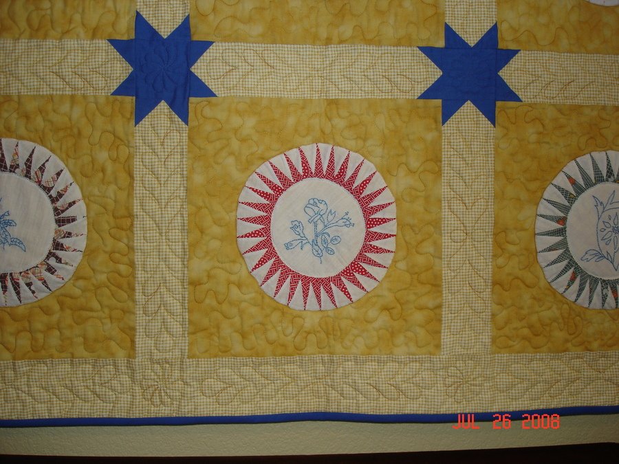 | Design Source - Description | Antique NY Beauty Blocks from EBay, I embroidered with redwork designs, pieced top from Vanilla Stars pattern. |