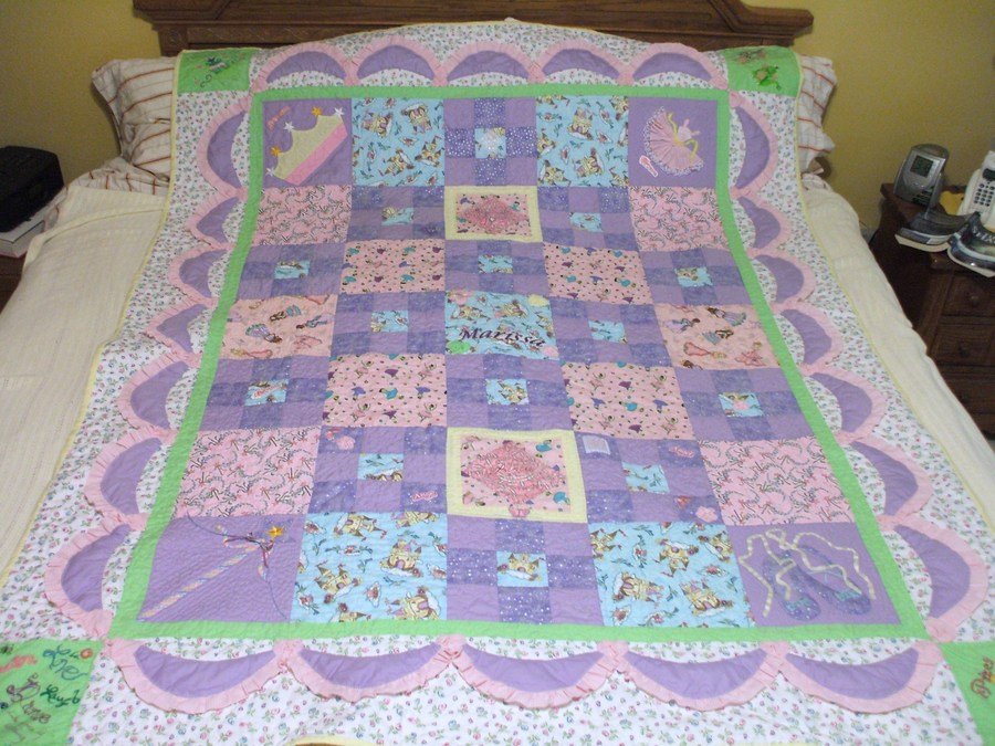 Anet47 Princess Ballerina - Commissioned to create, design, and make this twin size quilt for a new daughter due in August of 2008 by my A/C repairman. Design was based on a piece of wallpaper border used to decorate her room. Hand drawing and painting as well as commercially made iron-ons were used to embellish the squares. Colors were chosen per the wall paper. Had lots of fun and my quilting group oohed and aahhed.