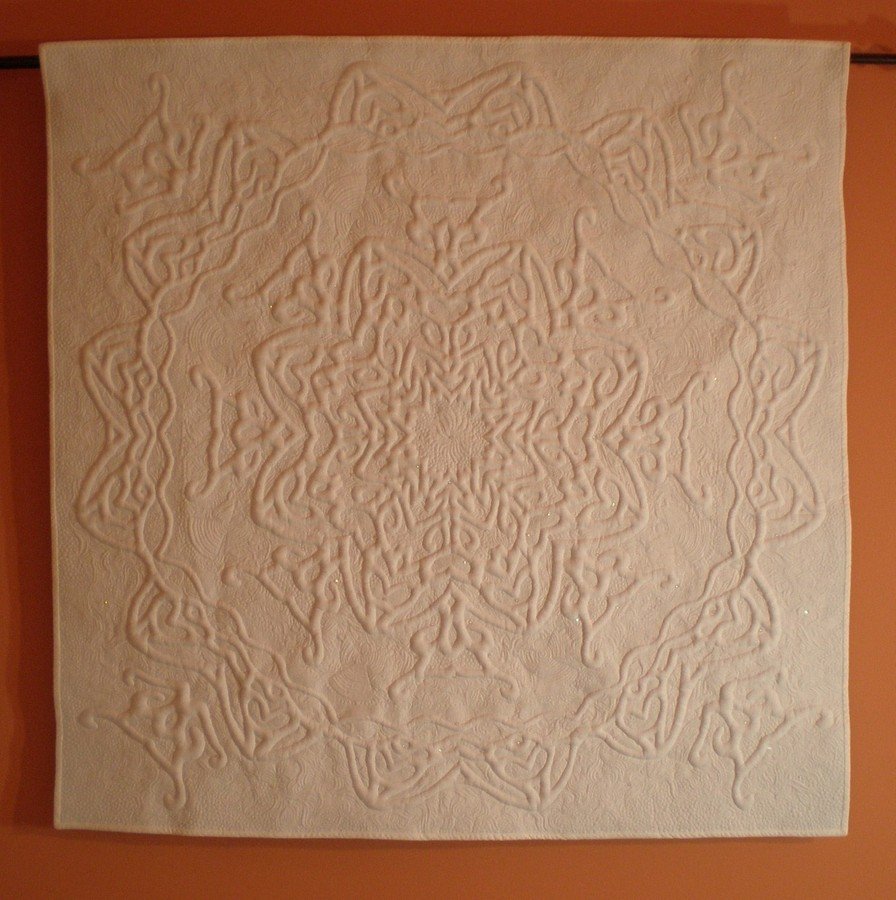 JudyJohnson-BCD Angels in the Snow - This quilt was my first wholecloth quilt. I loved making it, even when I decided to change the thread color and had to remove about 1/4 of the stitching! Now I make samples! What a great idea. This quilt brought back memories of my childhood days when my family would play in the sparkling snow and then in the morning the angels were all over the yard. I loved those days.