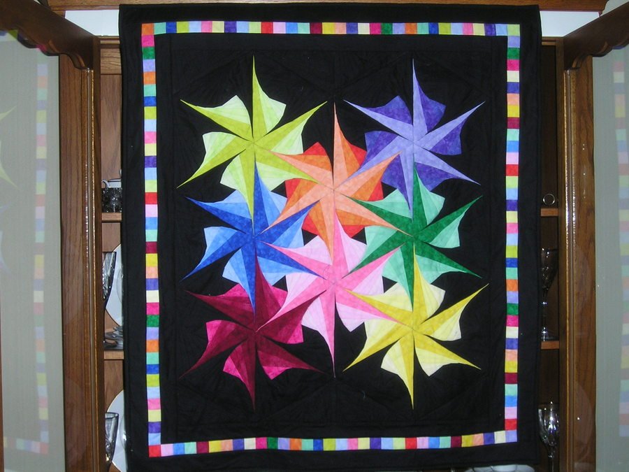 JackieOL My One and Only Windmill Log Cabin - This is a workshop project from a class I took with Bonnie Browning. The paper piecing put me to the test but I finished it in the end. Took me 12 blocks before I made one without having to rip something out! It's going in my office at school, both grandsons want it and I am not making another! You may have seen this pattern on a quilt at the opening of the Simply Quilts program that Alex had on HGTV. Always loved it!