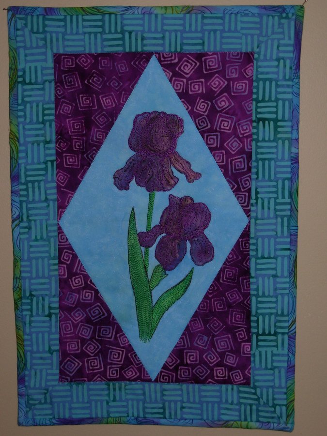 Kagun1 Irises - This was made as part of the WAQs (Whimsical Art Quilters) of Ukiah, California class. We learned to play with and have fun with Tsukeneko inks. Flower was traced on fabric from book and then I colored the fabric sky blue, the irises with shades of purple and then thread painted some highlights in. (Yeah, I know there was probably an easier way to go about it!)
