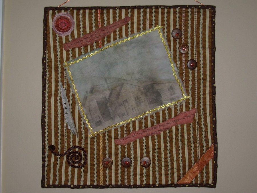 Kagun1 To be remebered - Made this with a picture taken in Bannack, Montana and printed on fabric that was then dunked in a handy cup of cold coffee, rinsed, splatered with Tsukeneko ink and pretty much trashed. The words were also printed on fabric and then burned around the edges. Quilted with Crazy stitches and have sewn on beads and weathered wood.