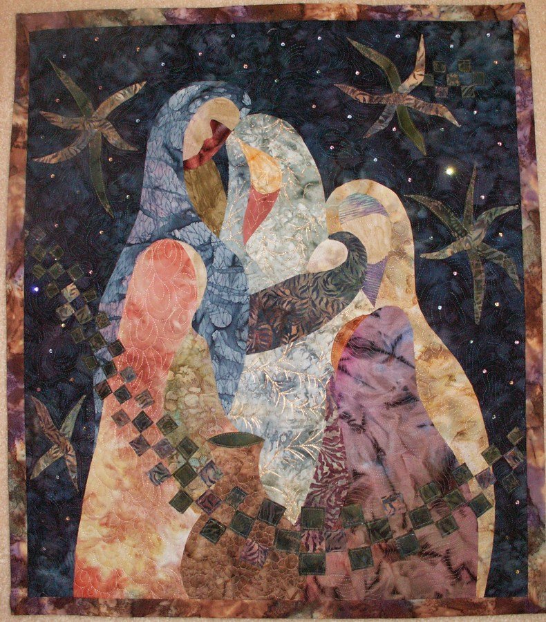 KimMc A Celebration of Sophia - This quilt was made for my sister to commemorate the birth of her fourth child, Sophia. I did a hand drawing, had it enlarged and then did a fusible applique out of batiks. The background is embellished with Swarovski crystals. This was my first attempt at creating an art quilt from my own sketch.