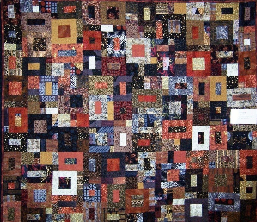LYNNA SCRAPPING BEAUTY - FOR YEARS, I SAVED MY FAVORITE FABRICS, MOST BY LONNI ROSSI. I COULDN'T DECIDE IF I SHOULD CUT THEM INTO SMALL PIECES OR USE LARGE PANELS, SO I DID BOTH. THIS QUILT IS MADE FROM THE SCRAPS OF A LARGE PANEL QUILT. IF IT WEREN'T FOR KATIE MASOPUST, I WOULD HAVE NEVER ADDED THE LIGHT SQUARES. SHE TAUGHT ME SO MUCH ABOUT COLOR/VALUE. THE BACK IS MINKE AND VERY SOFT. IT IS QUILTED IN A CIRCULAR PATTERN. I LOVE THE BACK AS MUCH AS THE FRONT. I USED RICKY TIMS TECHNIQUE TO PUT ON THE BINDING WITH NO HAND SEWING. I MUST HAVE PLAYED THAT VIDEO A DOZEN TIMES, BUT I GOT IT! Linda Theifolt quilted it.