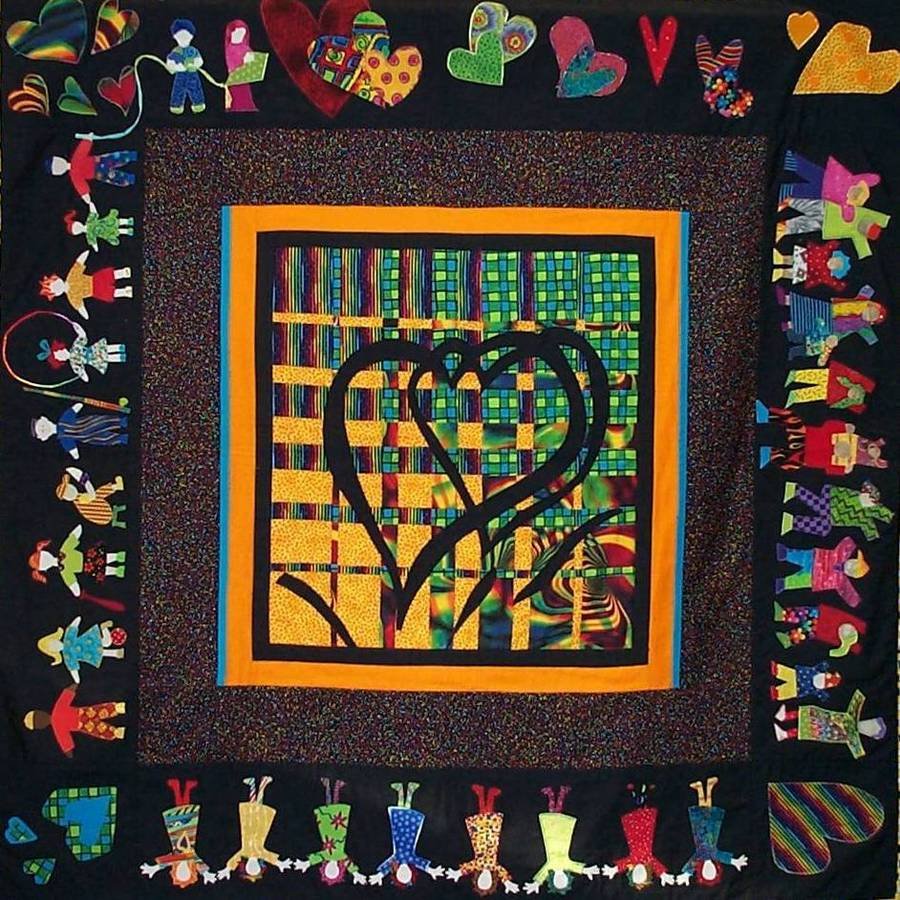 LYNNA ANNIE'S HEARTS - I MADE THE CENTER OF THE QUILT WHEN RICKY TIMS CAME TO ANN ARBOR, MI QUILT GUILD. I PROMISED MY DARLING, LITTLE NIECE ANNIE A QUILT, SO ADDED ONTO THE CLASS PIECE. THE GIRLS HOLDING HANDS IS FROM A BOOK I CAN NO LONGER LOCATE. I SWITCHED TO HEARTS AROUND THE SIDE TO GET IT DONE QUICKER! THERE WAS A LOT OF FUSSY CUTTING AND MACHINE APPLIQUE ON THIS QUILT. WHEN I GAVE IT TO MY NIECE AND SHE SAID TO HER MOM " I LOVE IT MAMA" I WAS SO HAPPY! I TOLD HER THAT THE 2 HEARTS ON THE QUILT REPRESENTED ONE FOR HER AND ONE FOR ME, SO THAT EVEN THOUGH WE LIVE FAR APART, OUR HEARTS ARE ALWAYS TOGETHER.