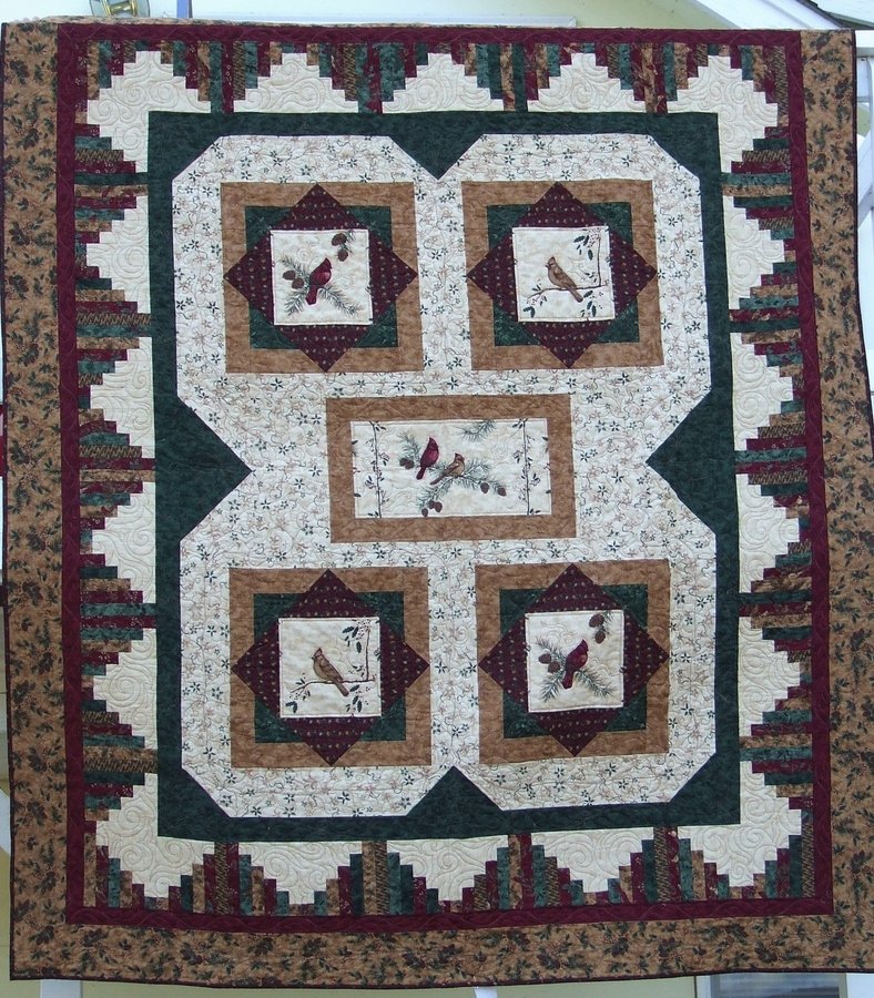 jstenkamp Christmas Cardinals - Created by fussy cutting the cardinals and creating the inner log cabin border by using various red, greens and browns. The back side is a rich marble green and the custom free-motion quilting, involving swirls and holly leaves, was done by Dar Farmer of Heart to Heart Quilters located in Merrill, Oregon