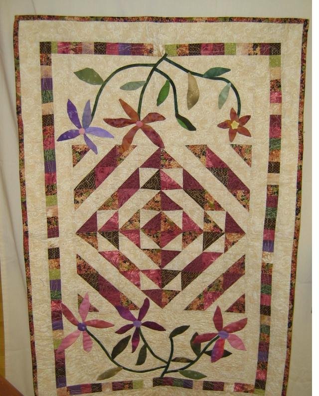 klwheeler My Flowers Dance for Joy - This was my quilting bee's project and I of course had to change the pattern for myself. I rescaled the center area and made the whole table runner wall hanging smaller. I also got very bored with the flowers all the same and the leaves all the same. So I free cut them and liked the results much more! I was just beginning to quilt and tried it on this one. I love the table runner, and yet it took about a year or two to finish, due to the hand appliqué and so many other projects that took precedence. Now my mother, Thelma Level Hooter, has it and is hanging it on her home wall in Texas, as I gave it to her for the 2009 Christmas present.