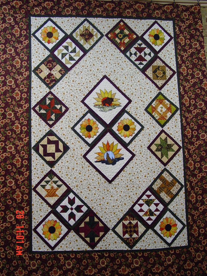 kansaspatches Kansas Song - This quilt was designed by me for the 2006 Kansas Prairie Shop Hop. Shops in the hop all exchanged blocks and these were used for the outer border. I used the applique pattern Prairie Sentinel for the Buffalo and Coyote in the center medallion. Sunflower blocks were added to make this a truly Kansas quilt.